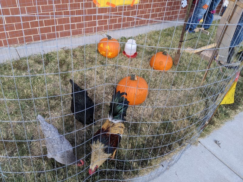 There were chickens and a rooster that were helping to carve pumpkins, and a table where students learned more about chickens and the eggs they produce.