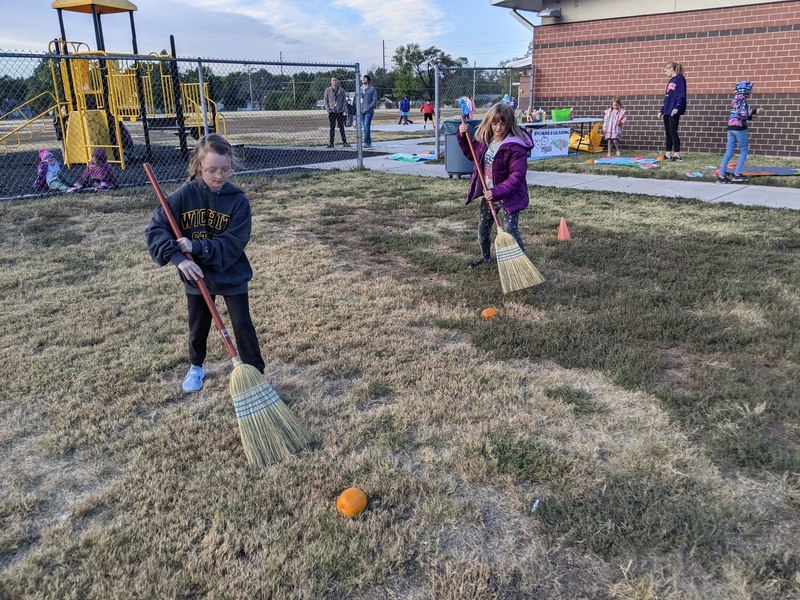 There were two team-building stations set up as relay races. One required students to use a straw-bristled broom to sweep miniature pumpkins across the grass and the other was a sack race.